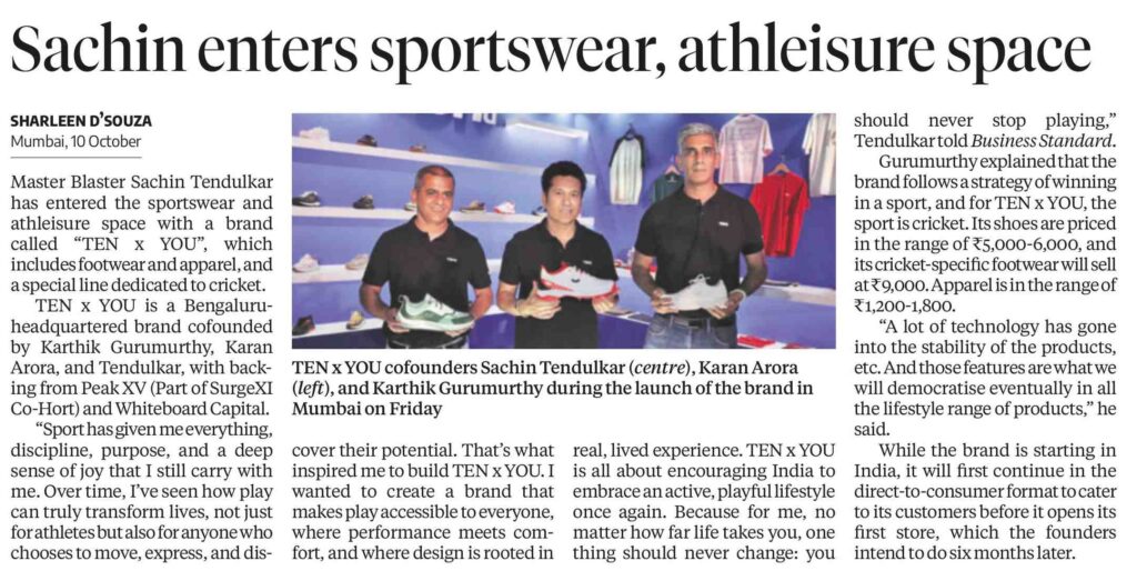 Co-founded with Karthik Gurumurthy and Karan Arora, the brand operates under SRT10 Athleisure Pvt. Ltd. and is backed by investors like Peak XV and Whiteboard Capital. TEN X YOU is built on Tendulkar’s decades of cricketing experience, aiming to combine performance, comfort, and real-world usability while making sports gear accessible to a wider audience.